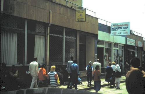 Raamattuseuran myymälä (keltainen kyltti) Addiksen keskustassa vuonna 1997