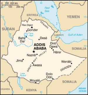 Aiemmin Abessiniaksi kutsuttu Etiopian liittotasavalta on noin kolme ja puoli kertaa Suomen kokoinen maa Afrikan sarvessa, väkiluvultaan vuonna 2009 noin 80 miljoonaa (kolmanneksi eniten Afrikassa). Maalla on yhteistä rajaa läntisen naapurinsa, Sudanin kanssa 1600 km ja saman verran etelässä olevan Somalian kanssa, pohjoisessa sijaitsevan Eritrean kanssa 830 km ja saman verran yhteistä rajaa Kenian kanssa; idässä olevan Djiboutin kanssa yhteistä rajaa on 340 km . Etiopia on alueeltaan Afrikan kolmanneksi laajin.