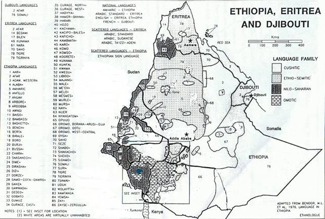 Yllä olevassa kuvassa näkyvät Etiopian kielialueet. Vasemmassa alakulmassa oleva neliö on alla suurennettuna kuvaamassa lähinnä Eteläisten kansojen osavaltiota, jossa kieliryhmien määrä on erityisen suuri. Tämän alueen heimot ovat ilmeisesti eläneet sen verran toisistaan eristyneinä, että jokaisella heimolla on oma kielensä.