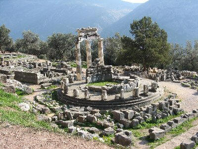 eli pyöreä rakennus, jonka käyttötarkoitusta ei tunneta. Delfoihin tultaessa