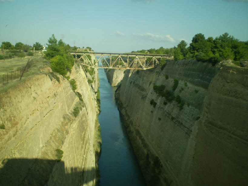 6,35 kilometriä pitkä kanava yhdistää toisiinsa Korintinlahden lännessä ja Saroninlahden idässä. Kanava rakennettiin vuosina 1882–1893. Sitä oli suunniteltu jo antiikin ajalta saakka, ja sitä edelsi 600-luvulla eKr. rakennettu Diolkos eli kivetty laivojen vetotie, jota pitkin kannaksen yli kyettiin siirtämään pieniä aluksia. Kanavan leveys on yläosassa eli maanpinnan tasolla noin 24,6 metriä ja vedenpinnan tasolla noin 21,3 metriä, ja sen seinämien korkeus on suurimmillaan noin 80 metriä. Edessä näkyy kanavan ylittävä rautatiesilta.
