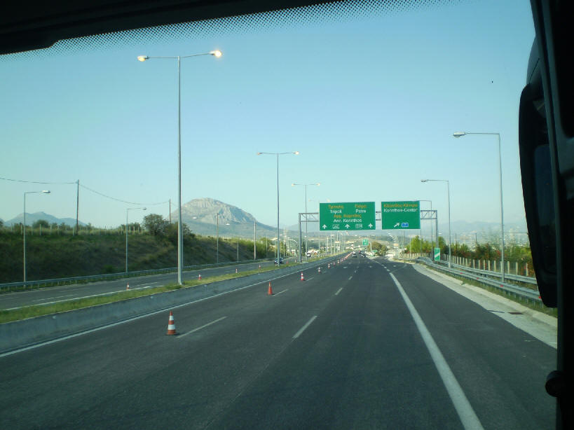 Meidän matkamme jatkuu kohti Korintia. Edessä pilkistää jo Akrokorintti, vanhan Korintin viereinen kukkula. Taitaa olla aika poiketa moottoritieltä.