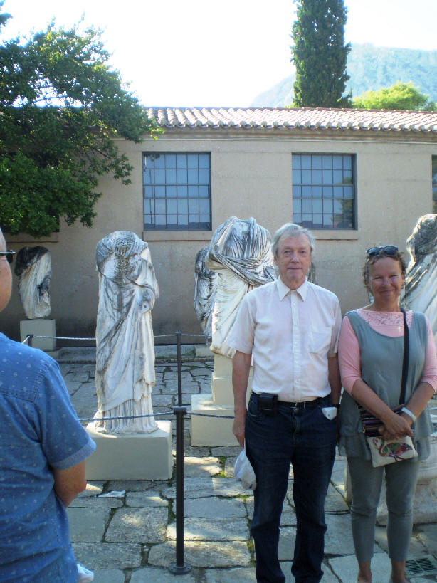 Opas Pirjoltakin heltisi hymy, kun yksi vanha mies änkeää hänen vireensä. Takanamme rivi torsoja. Koko patsasta ei tarvinnut tuhota, kun valta vaihtui. Laitettiin vain uusi pää tilalle. Museosta löytyi lisää päättömiä patsaita ja paljon muutakin nähtävää, mutta sitä ei saanut kuvata (kuvat voi katsoa netistä). Museossa on näytteillä esineitä, joita on kaivettu etupäässä vanhassa Korintissa vuodesta 1896 alkaen. Esillä on patsaita, mosaiikkeja, saviastioita ja sarkofageja. Museossa on esineitä esihistorialliselta ajalta alkaen, saviastioita, henkilöhahmoja ja työvälineitä. Asklepioksen huoneessa on jumalalle uhrattuja votiivilahjoja.