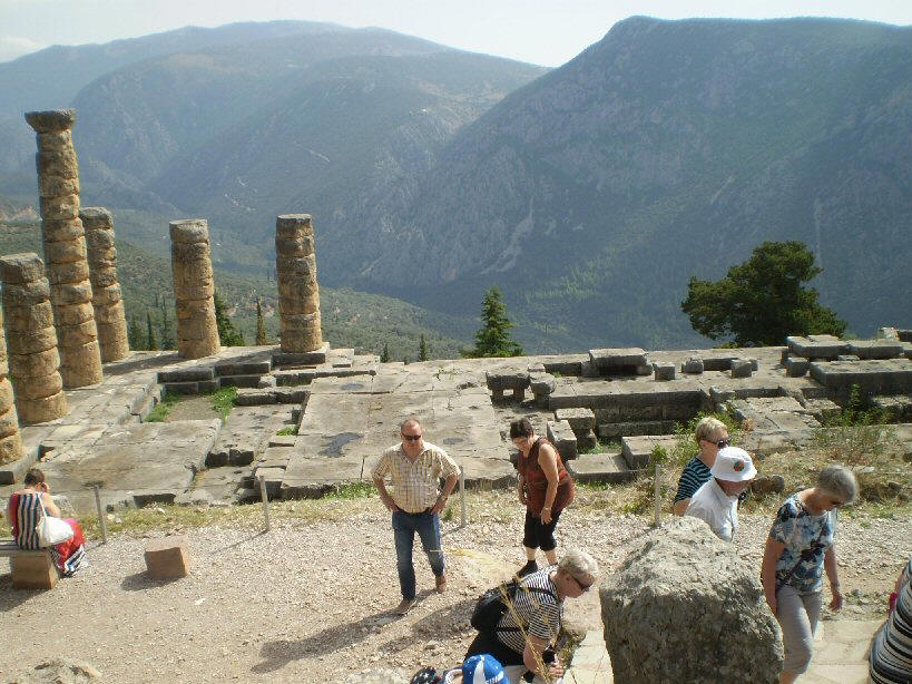Plataian käärmepylväs. Apollon temppelin itäpuolella sijaitsee käärmepylväs, kopio alkuperäisestä pylväästä. Pylvästä kiersi pronssikäärme ylös pylvään päähän asti huippuna kolme pronssista käärmeen päätä, jotka kannattelivat kultaista kolmijalkaa. Pltaian taistelun jälkeen (479 eKr.) kreikkalaiset juhlivat voittoa Persiasta teettämällä käärmepylvään, joka asetettiin nykyiselle paikalleen Delfoihin. Pylväästä on nähtävissä vain spiraalikierteet, mutta ei käärmeen päitä eikä kultaista kolmijalkaa. Vuonna 324 jKr. keisari Konstantinus I siirsi käärmepylvään Delfoista Konstantinopolin Hippodromille, jossa se on yhä tänään. Delfoissa on nyt vain kopio tästä pylvään tyngästä. Oikealla näkyy Prusias II:n pylväs.Taustalla keskellä Apollon temppeli, josta on jäljellä perustusten lisäksi 6 pylvästä.