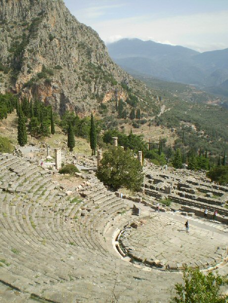 Apollonin temppelin yläpuolella sijaitsee Delfoin teatteri (kuva yllä oikealla). Teatterin katsomosta avautui näkymä näyttämölle taustanaan Apollon temppeli ja mahtava maisema, Fokiin laakso. Teatteri rakennettiin Parnassos vuoren liuskekivestä 300-luvulla eKr. Alimmat penkkirivit on rakennettu hellenistisellä ja roomalaisella aikakaudella.Teatterissa on 35 katsomoriviä, joihin mahtuu 5000 katsojaa. Näyttämöllä esitettiin näytelmiä, runonlausuntaa ja musiikkiesityksiä erityisesti juhla-aikoina.