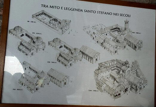 Alunperin kirkkoryppääseen kuului seitsemän kirkkoa, mistä se sai nimen Sette Chiese (seitsemän kirkkoa), mutta nykyään niistä on enää jäljellä neljä: Ristiinnaulitsemisen kirkko, Kolminaisuuden kirkko, Pyhän haudan kirkko sekä Pyhälle Vitalikselle ja Pyhälle Agricolalle omistettu kirkko. SantoStefanon pohjapiirros. San Stefanon historia alkoi 2000 vuotta sitten luultavasti pelkästä runsasvetisestä lähteestä. Lähde on vieläkin olemassa, vaikka se on Pyhän haudan kirkon alla.