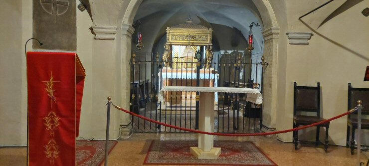Sisäänkäynti tapahtuu 1000-luvulla rakennetun Ristiinnaulitsemisen kirkon kautta, joka on pitkään sisältänyt kryptassaaan Bolognan suojeluspyhimyksen, Pyhän Petroniuksen luureliikit.