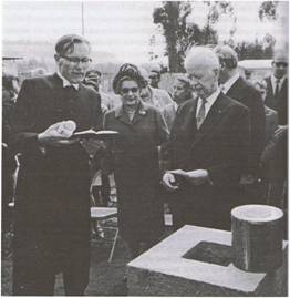 Addis Abeban synodin historiasta väitöskirjan laatinut pastori Johannes Launhardt kuvassa (vas.) laskemassa saksalaisen kirkon peruskiveä yhdessä presidentti, tri Lübken ja rva Lübken kanssa vuonna 1964.