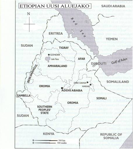 Etiopia voi hyvin olla ainoa Afrikan maa, joka on välttynyt siirtomaakohtalolta, mutta samalla se on ollut yksi viimeisimpiä, jotka ovat päässeet nauttimaan jonkinnäköisestä demokraattisesta hallinnosta.  Ensimmäinen yritys suunnan muuttamiseksi otettiin joulukuussa 1994, kun siirtymäajan hallitus otti käyttöön liittovaltion mallia noudattavan perustuslain, joka jakoi maan 11 osavaltioon, joille kullekin taattiin oma poliittinen itsehallinto aluettaan koskeviin asioihin ja suhteellinen edustus keskushallintoon. Tämä toimenpide merkitsi askelta kohti ensimmäisiä demokraattisia vaaleja toukokuussa 1995, jolloin Meles Zenawi äänestettiin pääministeriksi presidentti Negaso Gidadan rinnalle. Sama pari jatkoi vallan kahvassa seuraavissa vaaleissa vuonna 2000.  Vuoden 1995 lopulla maa näytti jättäneen vaivalloisen menneisyytensä taakseen, kun sillä oli demokraattisesti valittu hallitus, joka oli ylivoimaisesti tasa-arvoisin ja vähemmän sortava kuin mitä maa on koskaan ennen nähnyt.