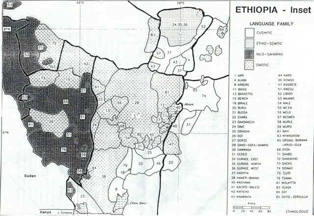 Yllä olevassa kuvassa näkyvät Etiopian kielialueet. Vasemmassa alakulmassa oleva neliö on alla suurennettuna kuvaamassa lähinnä Eteläisten kansojen osavaltiota, jossa kieliryhmien määrä on erityisen suuri. Tämän alueen heimot ovat ilmeisesti eläneet sen verran toisistaan eristyneinä, että jokaisella heimolla on oma kielensä.