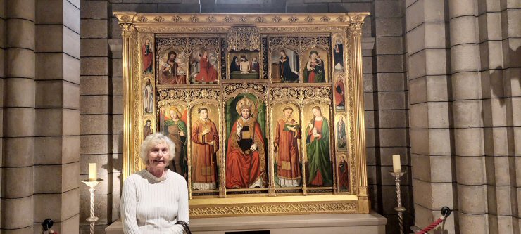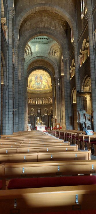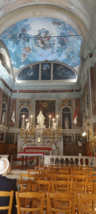 Kuvassa pääalttari Yksilaivaisessa kirkossa on oikealla seinän vierustalla pyhäinjäännöslipas ja seuraavassa lasikopissa François Joseph Bosion Kristusta esittävä puuveistos, jota kuljetetaan kaupungin läpi pitkäperjantaisin. Molempia seiniä koristaa rivi maalauksia ja patsaita. |